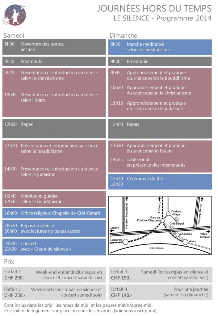 En complément à la démarche interactive des intervenants principaux, cet événement permettra également d’appréhender le silence par les sens : un repas en silence le samedi soir accompagné de lectures sacrées et suivi d’un concert par « Chant-du-silence », une cérémonie du thé et une marche méditative le dimanche.